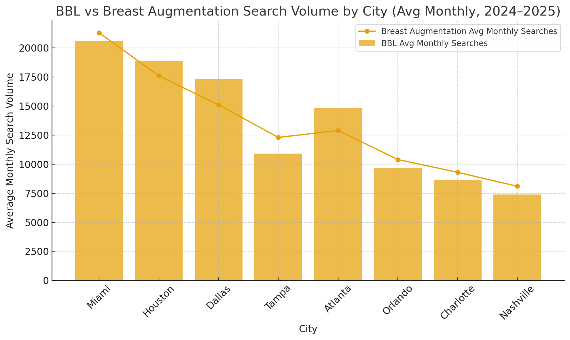 Across all eight cities, BBL search volume dipped slightly, while breast augmentation searches grew. That does not mean BBL is “over” in cities like Dallas, Miami, or Atlanta—but it does suggest that many patients are shifting attention toward procedures perceived as more established and predictable, such as breast implants or fat-transfer breast augmentation.