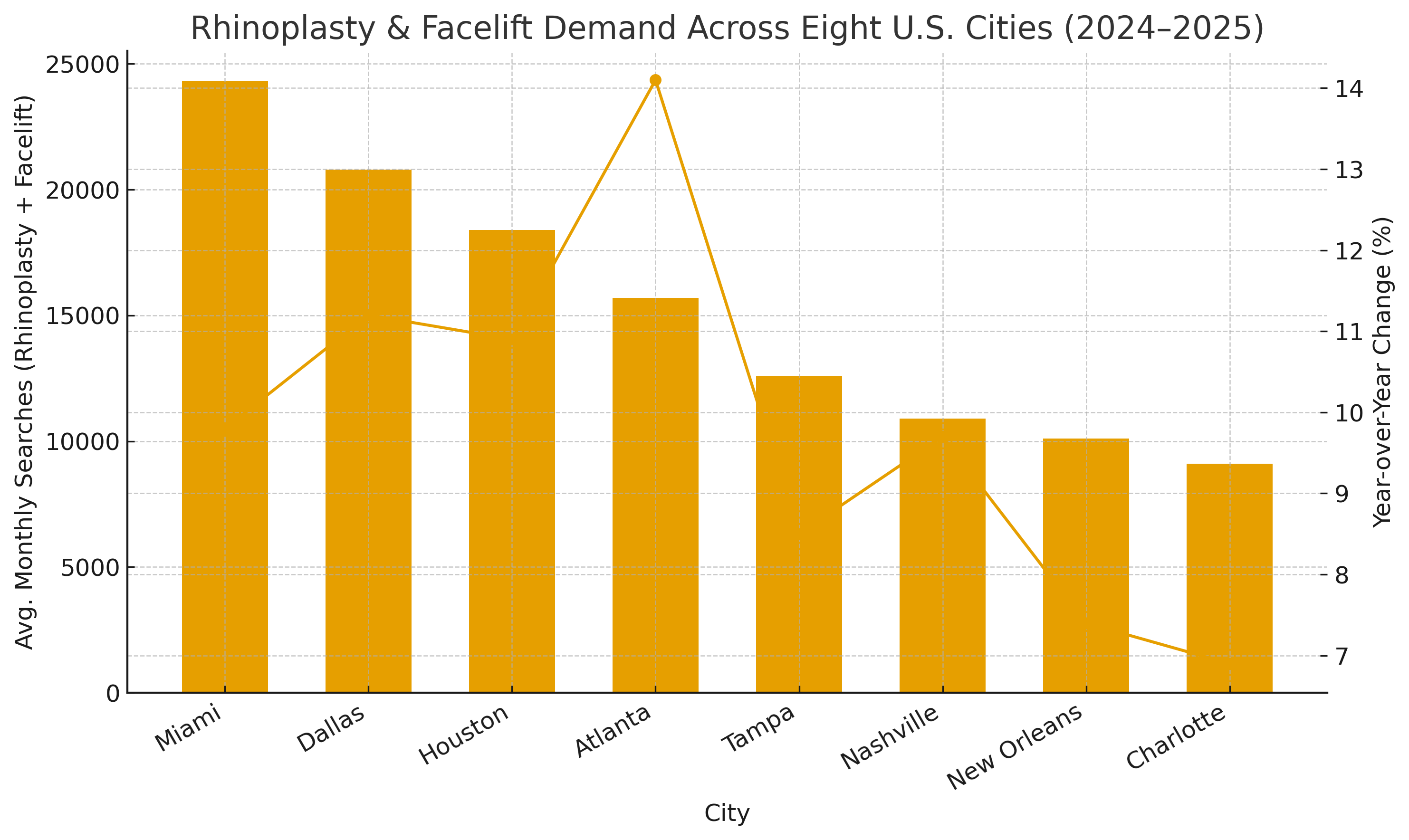 - Miami – ~24,300 combined searches/month (rhinoplasty + facelift), +9.8% YoY