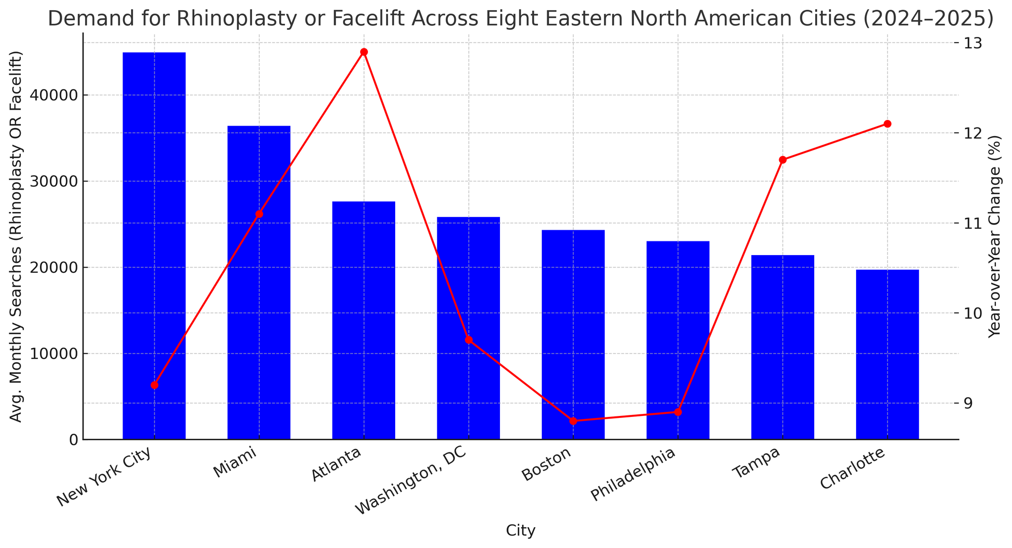 - New York City and Miami are the highest-demand markets for rhinoplasty or facelift in Eastern North America.