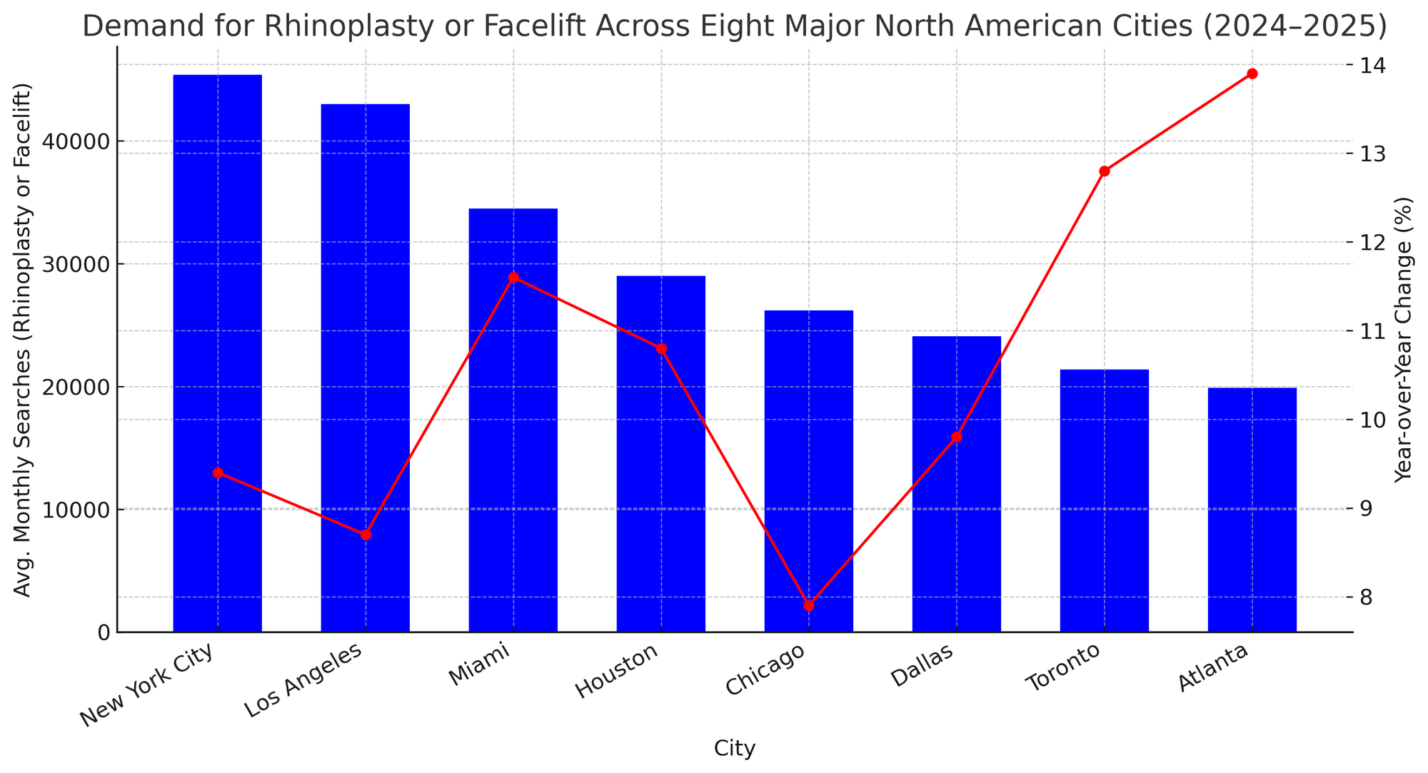 If you’ve been thinking about a rhinoplasty or facelift, look at real-world search behavior across eight major North American cities to understand where interest in facial plastic surgery is growing fastest.