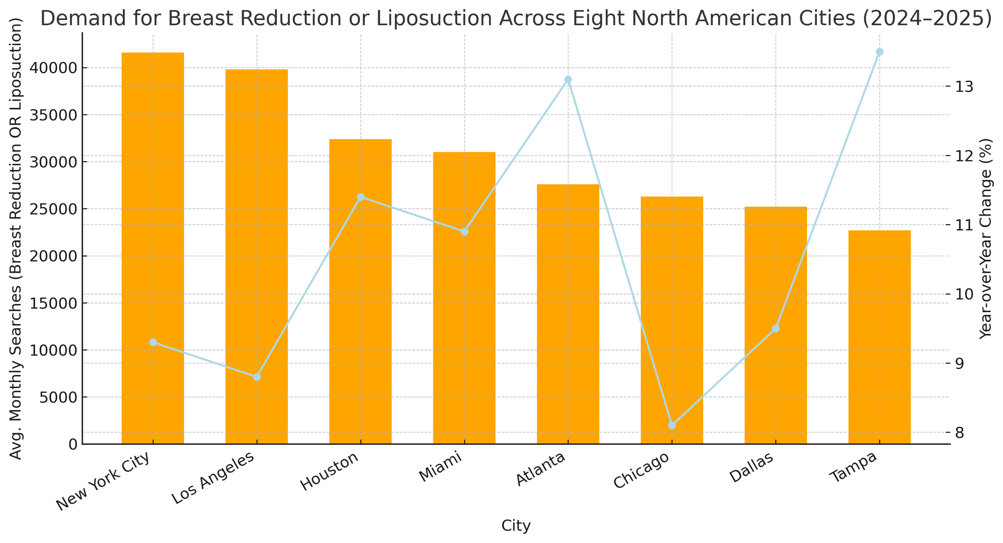If you’re in Tampa, Houston, Miami, Atlanta, Dallas, Chicago, New York, or LA, the data confirm you’re not alone—thousands of people in your city are actively researching breast reduction or liposuction every month.