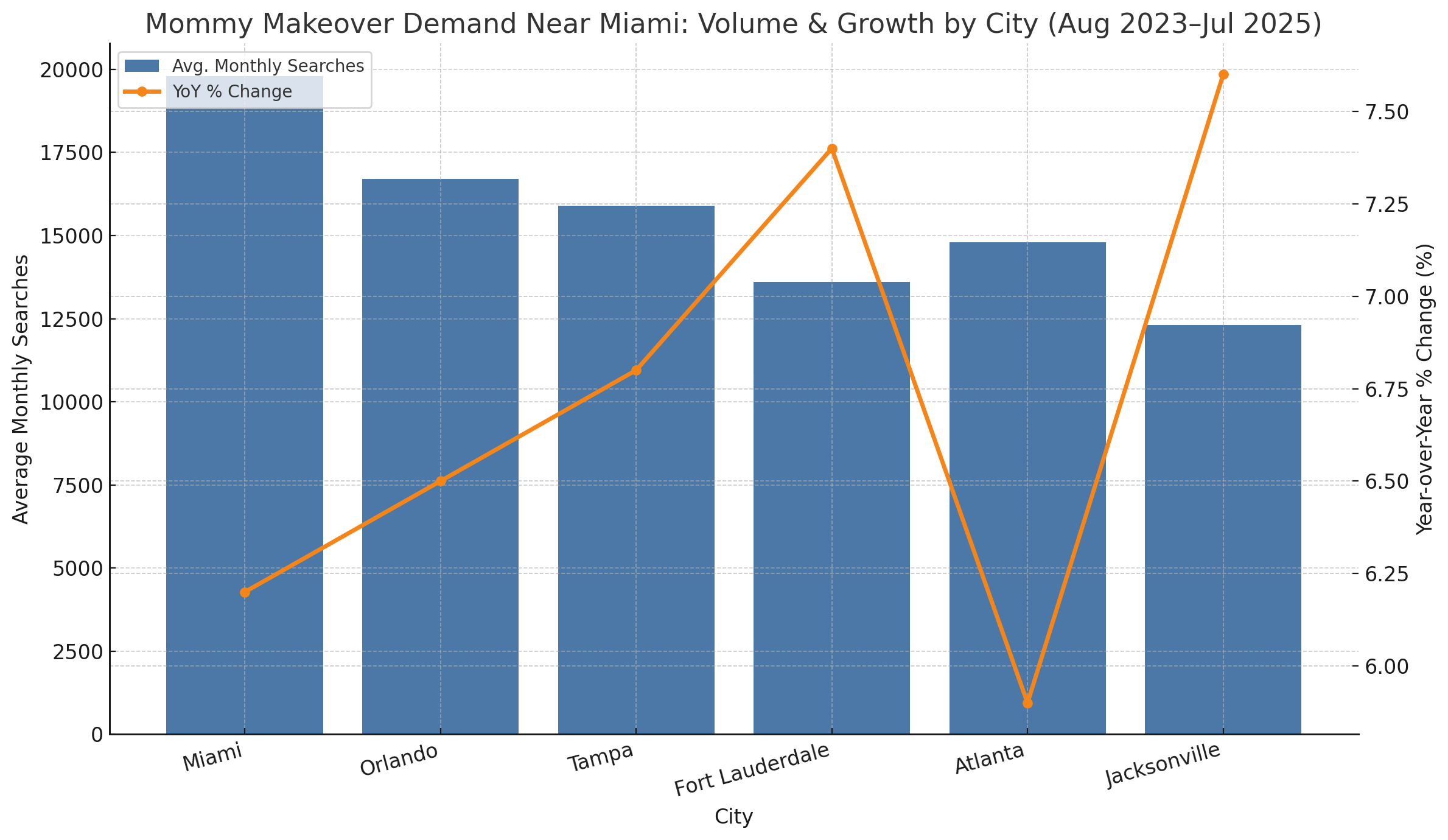 If you’re researching a mommy makeover—often a personalized combination of breast augmentation or lift, tummy tuck (abdominoplasty), and targeted liposuction—you’re not alone. Our latest Aesthetic Match analysis looked at Google Keyword Planner data across August 2023–July 2025 to understand where demand is strongest around Miami and where it’s accelerating. We aggregated average monthly searches and year-over-year (YoY) growth for six large metros: Miami, Fort Lauderdale, Orlando, Tampa, Jacksonville, and Atlanta.